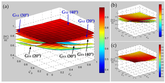 Sensitivity of shear modulus for 3D braided carbon/resin composites with different braiding angles (20°, 30°, 40°) to the distortion characteristic parameters and of a yarn: (a) general drawing, (b) shear modulus GXY, (c) shear modulus GYZ.