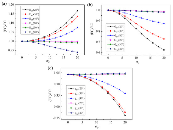 Based on the analysis of yarn elastic constants above, the ratio between the mean elastic constants and the ideal elastic constants of 3D braided carbon/resin composites with a 20° braiding angle is firstly investigated. As shown in Figure 7, the influence of the yarn random waviness effect on the elastic constants of 3D braided carbon/resin composites is presented. It is found from Figure 7a that all of the elastic constants are affected by the random waviness of the yarn path, and the elastic constants for 3D braided carbon/resin composites are affected differently from each other. Among them, it is found from Figure 7b that the transverse elastic modulus EXX increases slightly with the increase in the coupling fluctuation effect in the two planes of the yarn, but the influence of the random fluctuation of the yarn is almost negligible. The longitudinal elastic modulus EZZ is obviously affected by yarn waviness, but the influence trend of EZZ gradually slows down with the increase in the standard deviation and of a yarn. Specifically, when or , as in Figure 7c, it is found that the in-plane shear modulus GXY is less affected by the waviness in the x–y plane of the yarn, while the out-of-plane shear modulus GYZ is obviously affected by the waviness in both planes of the braided yarn, and the trend tends to be gradual. It is found in Figure 7d that the out-of-plane Poisson’s ratio γYZ shows the same characteristics as EZZ and GYZ, but the in-plane Poisson’s ratio γXY seems to be more obviously affected by the waviness in the x–z plane for yarn, and shows a sharp downward trend.