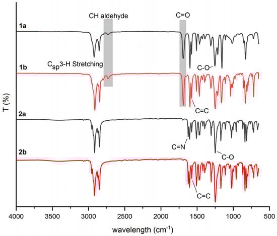 The infrared spectra of all the compounds, 1a–b, 2a–b, 3, and 4a–b were measured using FT-IR spectrometry and data were illustrated in Figure 1, Figure 2 and Figure 3. Figure 1 presents the FT-IR spectra of compounds, 1a–b and 2a–b. The absorption existing at 2922 and 2852 cm−1 was attributed to Csp3-H stretching. The C-H aldehyde can be seen at 2732 cm−1, and at peak 1689 cm−1, it corresponds to C=O stretching for compounds 1a–b. Moreover, the disappearance of these peaks for 2a–b confirmed the condensation reaction had been successfully completed. In addition, the adsorption at 1599 cm−1 and a sharp peak at 1253 cm−1 was assigned to C=C on an aromatic ring and C-O stretching, respectively. The characteristics of the Schiff-based compound was attributed to the appearance of a C=N peak at 1604 cm−1.