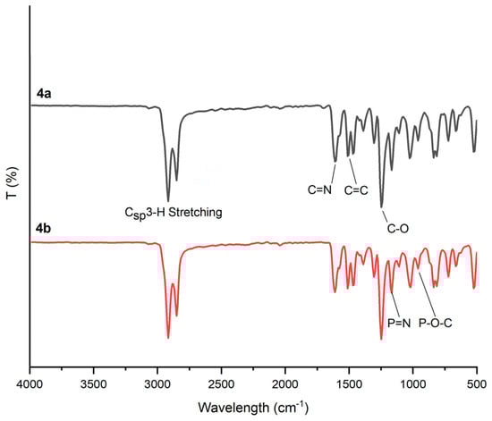 The FT-IR spectra for the final compounds, 4a and 4b, are presented in Figure 3. As seen in Figure 3, a similar peak pattern corresponding to C-H stretching, appeared at 2867 and 2929 cm−1. In addition, the C=N stretching for the Schiff-based linkage appeared at 1603 cm−1. Moreover, C=C stretching for the aromatic ring and C-O stretching are shown at 1509 cm−1 and 1249 cm−1, respectively. For cyclotriphophazene, the P=N ring was assigned at 1173 cm−1, with P-O-C bending at 959 cm−1.