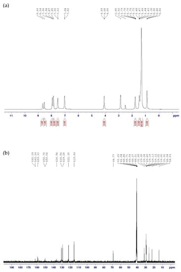 Figure 5a shows the 1H-NMR spectrum of compound 4a. Two singlets downfield at δ 8.67 and 8.56 ppm were ascribed to two azomethine proton signals. The doublets at δ 7.96, 7.88, 7.57, and 7.05 ppm were assigned to the eight protons from two aromatic rings. The triplets in the upfield region of δ 4.08 ppm corresponded to an aliphatic chain and another methylene appeared from δ 0.89 to 1.79 ppm.