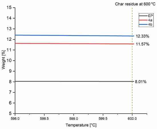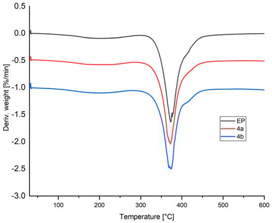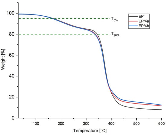 As shown in Figure 6, a slow mass loss take place which defined the decomposition temperature at 5% (T5wt%) and 20% (T20wt%) for all compounds. It can be seen that EP with flame-retardant (FR) additive compounds 4a and 4b has a much lower thermal decomposition than that of pure EP. Compared with T20wt% of EP with FR additives, the temperature dropped from 344.6 °C (pure EP) to 337.9 and 334.5 °C. This might be due to the contribution of the synergetic FR additives in the EP. The P-N content decomposes at a lower temperature allowing the carbonization of the EP matrix [,].