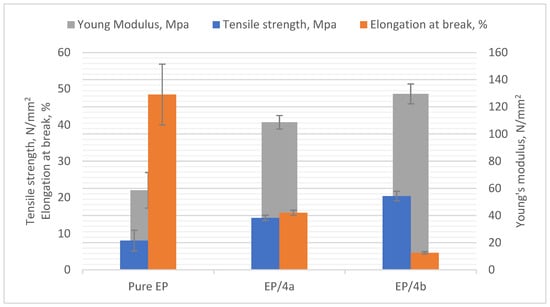 The tensile strength and Young’s modulus showed an increasing value for EP < 4a < 4b. The tensile strength went from 8.06 N/mm2 (pure EP) to 14.36 and 20.37 N/mm2 and the Young’s modulus went from 58.55 N/mm2 for pure EP to 108.67 and 129.58 N/mm2 for EP incorporated with compounds 4a and 4b, respectively. These phenomena were influenced by the increasing molecular weight and cross-linking attributed to the bulk compound and alkyl chain length of the additives []. The higher the tensile strength, the higher the ability of a material to bear maximum load, and the higher the Young’s modulus, the harder the material was to bend or deform.