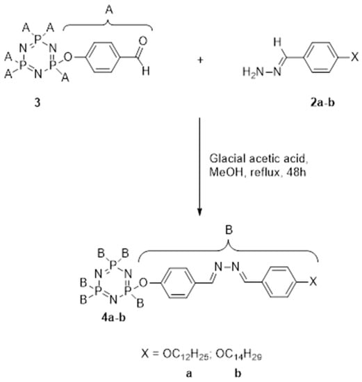 In this study, a new hexasubstituted cyclotriphosphazene has been synthesized and characterized. Intermediates 1a–b were synthesized using an alkylation reaction of 4-hydroxybenzaldehyde with different alkyl chains (dodecyl and tetradecyl) (Scheme 1) []. Intermediates 2a–b were synthesized using a condensation reaction of 1a-c with hydrazinium sulphate []. The reaction of hexachlorocyclotriphospazene, HCCP, with 4-hydroxybenzaldehyde gave intermediate 3 [] and further reacted with intermediates 2a–b to formed final compounds 4a–b []. The overall synthesis pathway for hexasubstituted cyclotriphosphazene compounds with different alkyl chain terminal ends with hydrazine bridged is shown in Scheme 1, Scheme 2, Scheme 3 and Scheme 4.