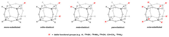 - Cordes, D.B.; Lickiss, P.D.; Rataboul, F. Recent Developments in the Chemistry of Cubic Polyhedral Oligosilsesquioxanes. Chem. Rev. 2010, 110, 2081. [Google Scholar] [CrossRef]