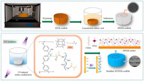- Liu, Z.; Zhang, M.; Wang, Z.; Wang, Y.; Dong, W.; Ma, W.; Zhao, S.; Sun, D. 3D-printed porous PEEK scaffold combined with CSMA/POSS bioactive surface: A strategy for enhancing osseointegration of PEEK implants. Comp. Part B 2022, 230, 109512. [Google Scholar] [CrossRef]