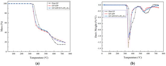 The char residues of pure EP, EP/APP, and EP/INTs-PF6-ILs composites at 735 °C are 15.06, 18.83, and 19.61 wt%, respectively. Compared with the pure EP, the char residues of EP/APP and EP/INTs-PF6-ILs composites were increased by 3.77% and 4.55%, respectively, as the APP can promote the dehydration of EP to form char under high temperature. Compared with EP/APP, the char residues of EP/APP/INTs-PF6-ILs composites were increased by 0.78%. In addition, the Ti and Tmax values of EP/APP/INTs-PF6-ILs composites were higher than the EP/APP composites, which could be clearly observed from Figure 1a. Between 300 and 540 °C, the line of EP/APP/INTs-PF6-ILs composites was always above the line of EP/APP composites. These results were observed since the addition of INTs-PF6-ILs has improved the thermal stability of the EP composite at low temperature. In contrast, above 540 °C, the line of EP/APP/INTs-PF6-ILs composites was below the line of EP/APP composites. Since at the time that the composite was burned, APP was first degraded to produce phosphoric acid, polyphosphoric acid and some other substances, which catalyzed the degradation and carbonization of EP composites, resulting in early decomposition of the EP composite. Meanwhile, INTs-PF6-ILs could facilitate this decomposition process, in order to obtain more char residue at high temperature. Moreover, the char residue could protect the EP composite matrix from further degradation and combustion, thereby leading to an incomplete degradation of the composite and improving the char residue rate of the composite at high temperature. Therefore, INTs-PF6-ILs showed a role of assisting the formation of char residue and protecting the EP composite from degradation.