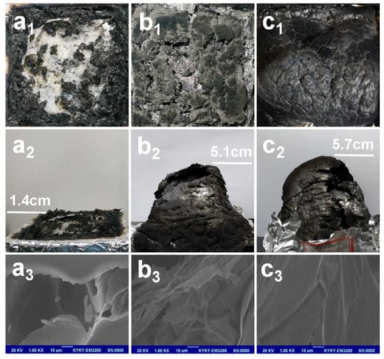 As shown in Figure 6(a1,b1), there was a very small char layer for the pure EP, where the tin foil at the bottom could be observed, and the char residue height was only 1.4 cm. Meanwhile, the only char residue was covered with intensive holes, which was fragmented and brittle. In addition, even large holes and cracks could be observed from its micro-morphology (Figure 6(c1)). This residual char was very poor to resist the erosion of heat and combustible gas.