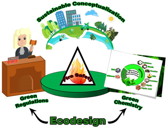 Science, industry, society, and policy are the four pillars or main actors of the sustainable development of FR additives. The harmonization of sustainability concerns is dependent on the realization and recombination of the interface between economic growth, social welfare, and environmental protection—in which both theoretical and practical concepts are required [2]. Some bio-based FR additives have been more recently used instead of systems that are non-degradable or have limited degradability, in line with the global focus on finding replacements for fossil-based materials [3]. Typically, the vast majority of bio-based FR additives originate from biomass or animals [4]. From a practical viewpoint, green chemistry can derive the usage as well as the synthesis of bio-based FR additives, but the extent to which it appears useful and efficient is pertinent to the execution and implementation of sustainable regulations in charge of ecological design (ecodesign), which are altogether fueled by sustainable conceptualization (Figure 1). Not surprisingly, in some regions such as North America, the aforementioned sectors of fire safety realm continue to struggle with being exempted under existing instructions, which means that sustainability concerns are not considered in decision-making strategies. Thus, there is lack of trade-off between the environmental, human health, and engineering requirements in the design and commercialization of sustainable FR additives.