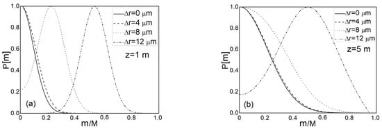 Figure 2 depicts the evolution of the fiber length-dependent normalized output modal power distribution P(m,λ,z). The numerical calculations assume a Gaussian beam P(θ,z) launched with = 0° (Equation (5)). The results are shown for four different radial offsets, = 0, 4, 8, and 12 µm. Low-order modes’ coupling is stronger in short fibers (their modal distributions have already shifted towards m = 0). Due to the transfer of optical power during transmission from lower- to higher-order modes, higher-order modes can only be coupled with longer fiber lengths. The midpoints of all modes’ power distributions have been moved to zero (m = 0) at the coupling length of Lc = 18 m, resulting in the EMD, Figure 2d. SSD is established at z ≡ zs = 60 m. It should be noted that a coupling length of Lc = 31 m is reported for a conventional GI POF, which had the same coupling coefficient D = 1482 1/m and was investigated in our previous work []. The smaller core radius and consequently fewer propagating modes in the GI mPOF than in a conventional GI POF (the maximum principal mode number for a conventional GI POF was M = 656) result in a shorter coupling length in the former. To put it another way, fewer propagating modes need to couple together for a shorter length. Silica MOFs have significantly less mode coupling than the GI mPOF that was the subject of this study and, therefore, much longer lengths Lc from ≃ 1.45 to 1.65 km at which an EMD is achieved and length zs from ≃ 3.30 to 3.80 km at which an SSD is established []. One should note that in modeling optical fibers with a GI distribution, it is commonly assumed that D is constant, i.e., it is independent of m []. The same assumption of mode-independent D is also used in modeling step-index microstructured polymer optical fibers [,].
