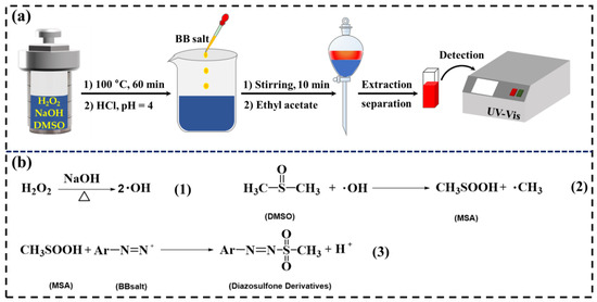 A quantitative study of hydroxyl radical (·OH) derived from alkaline solution by UV-Vis absorption spectroscopy was performed. As shown in Figure 1a, the mixed aqueous solution consisting of NaOH (4, 12 and 24 g), H2O2 (0, 0.4, 1, and 2 g), and 23.4 g of DMSO was reacted at 100 °C for 60 min. Then, 1 mL of the reacted solution was diluted to 500 mL with pH = 4. Moreover, 1 mL of BB salt was added to 2 mL of the diluted solution and reacted for 10 min at room temperature. The diazo sulfone derivatives were extracted, separated, and detected by UVs spectrum (UV-1800, Shimadzu, Japan) at 415 nm in a range of 350–800 nm and a standard curve of CH3SOOH solution [48,49]. The chemical reactions in the process of the ·OH quantitative detection are shown in Figure 1b. The production of hydroxyl radicals in a high-temperature alkali/H2O2 system is shown in chemical Equation (1). DMSO, as a radical scavenger, captured the ·OH to produce methane sulfinic acid (MSA), as shown in chemical Equation (2). Simultaneously, the diazo sulfone derivatives were formed through the reaction of MSA and Blue BB salt (chemical Equation (3)).