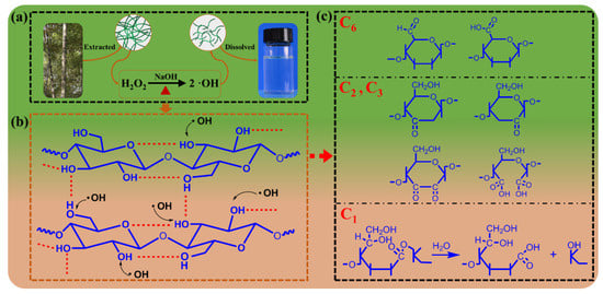 (a) Bamboo pulp with high Mη converted into low bamboo pulp with high solubility through one-step processing (a). (b) The reaction of ·OH with hydroxyl groups in cellulose chains and various cellulose oxidation products (c).