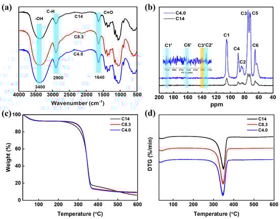 (a) FT-IR spectra of untreated (C14) and treated (C8.3 and C4.0) bamboo pulps. (b) Solid-state 13C CP/MAS NMR spectrum of untreated (C14) and treated (C4.0) bamboo pulps. The curves of TGA (c) and DTG (d) of untreated (C14) and treated (C8.3 and C4.0) bamboo pulps under a nitrogen atmosphere.