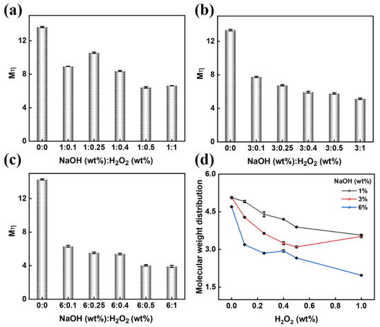 The effect of H2O2 concentration (from 0 to 1 wt%) on Mη in the concentration of NaOH, including 1 wt% (a), 3 wt% (b), and 6 wt% (c). (d) DMw/Mn of bamboo cellulose in different NaOH/H2O2.