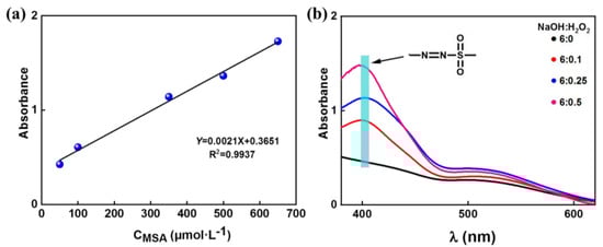 A standard curve of the relationship between the concentration of MSA (CMSA) and absorbance is presented in Figure 5a. The formula was Abs = 0.0021 × CMSA + 0.3651, with R2 = 0.9937. Based on this, the total amount of ·OH was calculated, as shown in Figure 5b. The absorbance was up to 1.486 in the mixed solution of 6 wt% NaOH and 0.5 wt% H2O2, and the absorbance increased with the increasing H2O2 mass fraction. Moreover, this linear rule was also compounded in the mixed solution containing 1 wt% NaOH and 3 wt% NaOH systems (Figure S1). Due to the fact that the detected products had a short lifetime and that the reactive radical species were difficult to detect, the detected data are approximate values in the three cases. The relationship between the amount of ·OH and Mη is shown in Figure S2: the more·OH produced, the lower the Mη.