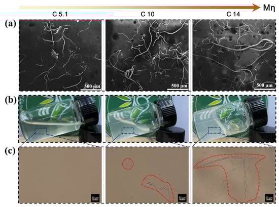 (a) The SEM images of bamboo cellulose with the Mη of C5.1 and C10 and C14. (b) Optical pictures of bamboo cellulose solutions with the Mη of C5.1 and C10 and C14. (c) Optical microscope images of bamboo dissolving solutions with the Mη of C5.1 and C10 and C14.