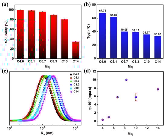 The solubility (a), gel temperature (b), DLS curves (c), and viscosity (d) of bamboo cellulose with different Mη in LiOH/urea aqueous solutions.