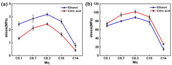 The tensile stress curves of hydrogels (a) and films (b) with Mη of C5.1, C6.7, C8.3, C10, and C14.