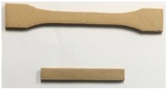 The prepared filaments were used for FFF 3D printing in a desktop-level 3D printer (MOSHU S10, Hangzhou Shining 3D Technology Co., Ltd., Hangzhou, China). The sample model file (STL file) for the test used computer-aided designed and was then sliced and transformed into G-code. The diameter of the 3D printer nozzle was 0.4 mm. The print temperature and speed were set to 220 °C and 50 mm/s, respectively, and the layer height was set to 0.1 mm. The 3D-printed pieces are shown in Figure 2.