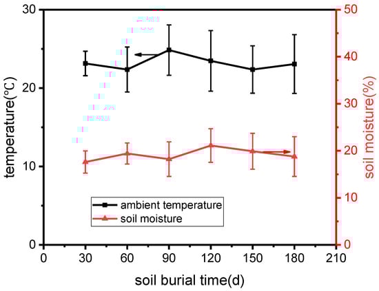 Natural soil was wetted and collected in a 30 × 20 × 20 cm3 container. Then, the samples were buried at 12 cm below the surface of the soil for up to 180 days. During soil burial, the moisture of the soil was measured and recorded every 5 days. Once the moisture was found to be lower than 15%, some water was added to the soil to keep the moisture between 15% and 25%. The average indoor temperature and soil moisture during the burial test are illustrated in Figure 3. At the desired times (30, 60, 90, and 180 days after burial), the buried specimens were dug from the soil, rinsed in water, and dried in a hot-air oven to a constant weight prior to taking photos; then, the samples were weighed and tested for their flexural properties and characterized.