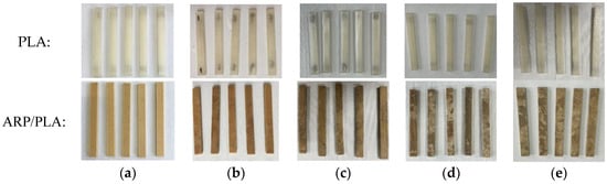 - The surface color was homogeneous for both PLA and ARP/PLA before soil burial, and no obvious color change was observed on the surface of PLA in the early degradation period. After 60 days, the material’s surface became slightly darkened but not obviously. However, the surface of ARP/PLA became gray with some black spots and crevices throughout the soil burial degradation process, especially after 60 days.