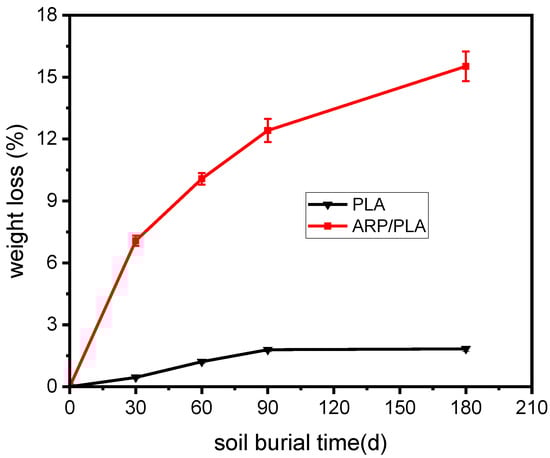 The weight loss percentage in the PLA and ARP/PLA samples after burying them for 30, 60, 90, and 180 days in soil is depicted in Figure 5, which shows that the fraction of weight loss in both the plain PLA and biocomposite samples presented in this work steadily increased with increased days of soil burial. We also found that the weight loss of PLA was very minor during the whole experiment; this result may be due to the hydrophobic properties of PLA, as well as the narrowly distributed microorganisms, which can degrade PLA in a soil environment. Figure 5 also shows that the printed ARP/PLA specimens always exhibited much greater weight loss than the PLA specimens with the same soil burial duration, meaning that ARP/PLA was more biodegradable than pure PLA. A greater difference in the weight loss fraction between the two samples was produced after a longer soil burial. After being buried in soil for 180 days, only 1.83% weight loss was observed in plain PLA, while 15.52% weight loss was observed for the ARP/PLA biocomposite samples. From the perspective of weight loss, the incorporation of ARP could accelerate the degradation of PLA in soil burial, which agrees with the results of the physical observations. The greater weight loss in ARP/PLA corresponds to an increased degradation rate due to the weak bonding between ARP and PLA, the easier degradation of ARP (a natural fiber) compared to PLA, and the synergetic effect due to the higher water adsorption by ARP [].