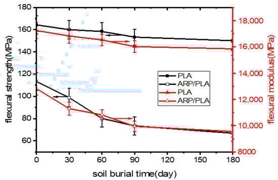 - After burying the samples in soil for 180 days, huge drops of 41.01% and 25.49% in the flexural strength and modulus were observed for ARP/PLA composites. The drops were, respectively, 8.64% and 8.06% for plain PLA.