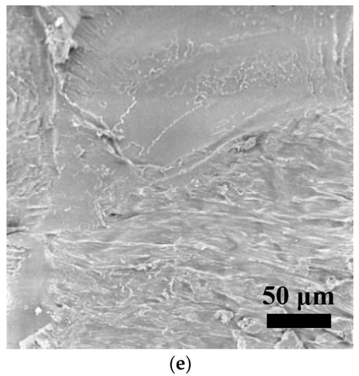 Figure 7a–e and Figure 8a–e present the fracture surfaces of FFF 3D-printed PLA and ARP/PLA biocomposite specimens at different soil burial stages, respectively. The PLA before soil burial (Figure 7a) shows a relatively smooth and clear surface, indicating a brittle failure mechanism. After soil burial, the PLA matrix showed a rougher surface of failure, but no microvoids or cracks appeared, indicating that soil burial did not obviously affect the degradation of PLA, which was in agreement with the weight loss and flexural data. Regarding the SEM micrographs of ARP/PLA biocomposites, Figure 8a–e show that the cross-sectional surface became slightly coarse (but not significantly) after soil burial for 30 days (Figure 8b). After being buried in soil for 60 days; however, the fracture surface became much rougher, and some microvoids appeared (Figure 8c). With the continuation of soil burial, much greater voids and cracks could be observed, as shown in Figure 8d,e. These voids and cracks corresponded to the weakened interfacial bonding between the fibers and the polymer matrix. Thus, the SEM micrographs indicate that ARP was not totally miscible with PLA and that the incorporation of ARP accelerated damage to the structure of the printed samples during soil burial.