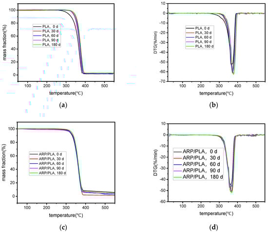 TG–DTG curves of different samples in different degradation periods: (a) TG curves of PLA; (b) DTG curves of PLA; (c) TG curves of ARP/PLA; (d) DTG curves of ARP/PLA.