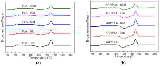 The secondary heating curves of different specimens in different degradation periods. (a) PLA; (b) ARP/PLA.