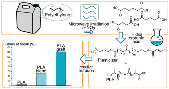 As one of the most promising approaches to realizing the upcycling of plastic wastes, chemical recycling of thermoplastic waste has been developing rapidly in recent years [146,147]. Bäckström et al. [148] adapted nitric acid as an oxidizing agent to degrade PE waste into dicarboxylic acids under microwave-assisted hydrothermal conditions. It was found that the total yield of reaction products reached 71%, and the carbon efficiency of the above process was 37%. Besides, the length of dicarboxylic acids can be tuned by controlling the reaction time and temperature, as well as the content of nitric acid. In order to further realize the upcycling of PE waste, the prepared dicarboxylic acids such as succinic, glutaric, and adipic acids were utilized to prepare a value-added plasticizer with crotonate end groups, as shown in Figure 7 [149]. After the addition of plasticizer, the strain at break of grafted PLA increased from 6% to 156%, and the glass transition temperature of PLA was reduced by 10 °C, due to the plasticization and compatibilization of the grafted plasticizer. Kots et al. [150] studied the hydrogenolysis of PP waste in the presence of different transition metal/titania (M/TiO2) catalysts. It was confirmed that Ru/TiO2 was an active and selective catalyst for PP waste, and the hydrolysis of PP waste occurred at relatively low temperatures with a modest H2 pressure. As a result, the formation of lubricant-range hydrocarbons (66–80%) with low contents of methane was achieved, making it possible to replace the commercial base or synthetic oils.