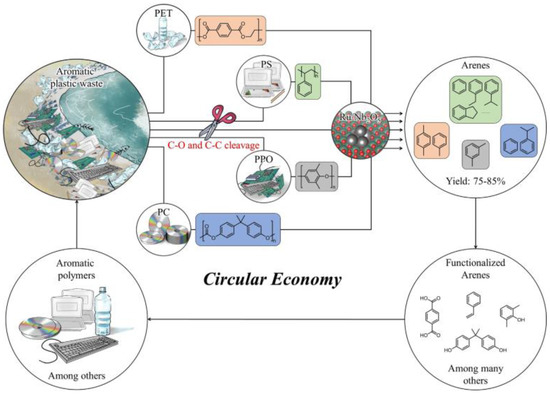 The upcycling of aromatic plastic waste has also been reported. In the work of Sharma et al. [151], the post-consumer PET flakes were depolymerized in a microwave reactor and then converted into terephthalamides in the presence of ethylene diamine. After that, the amine-terminated terephthalamides, together with paraformaldehyde and cardanol, were used to prepare bis-benzoxazine resins containing amide linkages through Mannich-type condensation. It was found that the curing temperature of the above-mentioned synthesized resins was lower than mono-benzoxazine due to the high functionality of oxazine; moreover, the cured benzoxazine resins have high thermal stability and good lap shear strength because of the large amount of polymerizable benzoxazine. Jing et al. [152] investigated the effect of a Ru/Nb2O5 catalyst on the hydrogenolysis of various aromatic plastic wastes. The Ru/Nb2O5 catalyst is a multifunctional catalyst that can selectively break the C-O and C-C linkages of aromatic plastics and also prevent the hydrogenation of aromatic rings. As a result, the Ru/Nb2O5 catalyst not only allows the selective conversion of individual aromatic plastics but also enables the simultaneous conversion of a mixture of aromatic plastics to arenes with a high yield (75–85%), as shown in Figure 8.