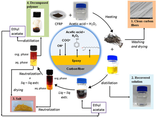 - Das, M.; Chacko, R.; Varughese, S. An efficient method of recycling of CFRP waste using peracetic acid. ACS Sustain. Chem. Eng. 2018, 6, 1564–1571. [Google Scholar] [CrossRef]