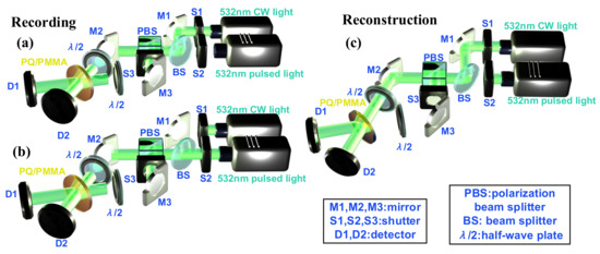 In the experiment, a twined holographic storage system is set up, as shown in Figure 1. In this system, a 532 nm CW source is firstly coupled into the optical path of pulsed holographic recording. The coupled beams can be interfered inside the medium by the splitting of PBS. Electronic controlling shutters (ECS) with the accuracy of 20 ms are adopted to adjust the exposure flux of the CW source. Meanwhile, a pulsed laser with 532 nm wavelength and 6 ns duration is applied to rapid holographic recording. The whole system can be divided into two parts: recording and reconstruction. In the recording process, two exposure approaches are adopted, i.e., the CW and pulsed exposure. In the CW exposure process, we keep S3 on and S2 off, while S1 is controlled by ECS to generate one-time exposure with different ms level duration, as shown in Figure 1a. The ms level pulsed exposure is divided into two beams with equal intensity, the same polarization and constant phase difference. These two beams begin to meet on the surface of recording material and generate interference in PQ/PMMA polymers to record the volume holographic grating. In the pulsed exposure process, we keep S2 and S3 on and S1 off to generate the holographic diffracted gratings inside the material with ns pulsed exposure, as shown in Figure 1b. After recording, a reconstruction system with CW exposure can be applied to examine the diffraction characteristics of two recording approaches, where we keep S1 on and S2 and S3 off, as shown in Figure 1c. The holographic diffracted grating recorded in PQ/PMMA materials is irradiated by the same optical path as the recording beam to generate the diffraction effect, and the holographic performance is evaluated by the intensity of diffracted light. Compared with pulsed exposure, the CW light can provide stable exposure energy, which indicates the readout intensity of diffracted gratings can be more constant. Based on this system, the HRE on PQ/PMMA polymers under different duration levels can be investigated experimentally. It is worth noting that the reason for choosing 532 nm laser as the recording and reconstruction light source is that the PQ/PMMA material has good absorption in this wavelength, and will not produce a holographic scattering effect [23,24] due to excessive absorption, which may affect its holographic performance.