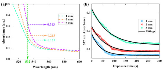 Figure 2. (a) The absorption spectrum of PQ/PMMA polymers with 1–3 mm thickness, (b) experimental results of absorbance variations in 1–3 mm thick PQ/PMMA polymers.