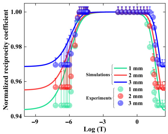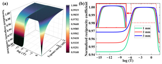 In our simulation, the polymerization and reduction relaxation are set to the magnitude of 10−6 and 10−2 according to the fitting results in refs. [28,29], respectively. We simulate and analyze the influence of exposure energy and material thickness on HRE. Figure 3a depicts the nonlinear relationship between the exposure energy and the reciprocity coefficient. The total temporal range is set to 10−16~102 s. The GRoDE will stay constant if the reciprocity coefficient remains stable, which means HRM occurs; otherwise, the HRF will emerge. It is found that the range of HRM in PQ/PMMA polymers is approximately 10−6~102, as shown in Figure 3. Meanwhile, the matching range can be extended by raising the exposure energy, which indicates higher exposure energy can reduce the influence of HRF on rapid holographic storage. Figure 3b illustrates the influence of material thickness on the HRE. The material thickness determines the absorption coefficient in recording medium, which implies it can affect the authentic absorptive rate of the exposure. Although the influence of material thickness is not as severe as the exposure energy, it can still be regarded as an optimization indicator to improve the range of HRM. Hence, the effect of HRF on holographic properties can be effectively avoided by controlling the material thickness and the exposure energy in holographic recording. However, if we want to broaden the range of HRM, a kind of new material with a faster polymerization rate needs to be found, which will be our main research direction in the future.