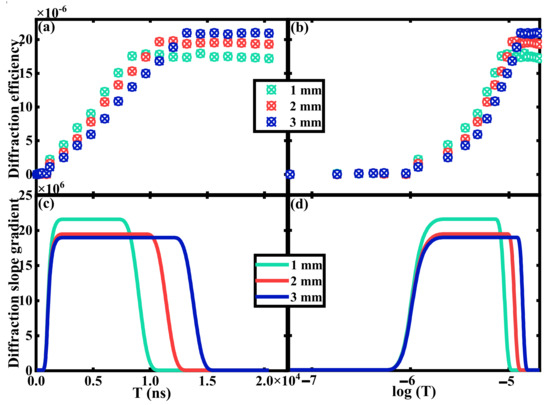 Figure 4. Temporal diffraction characteristics of HRE by ns level exposure with (a) linear abscissa (T), (b) logarithmic abscissa (log(T)), and the diffraction slope gradient with (c) linear abscissa (T) and (d) logarithmic abscissa (log(T)).
