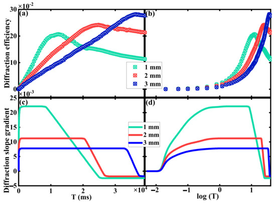 Figure 5. Temporal diffraction characteristics of HRE by ms level exposure with (a) linear abscissa (T), (b) logarithmic abscissa (log(T)), and the diffraction slope gradient with (c) linear abscissa (T) and (d) logarithmic abscissa (log(T)).
