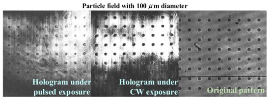 Figure 7. Reconstructed holograms of 100 μm particle field with pulsed and CW exposure method.