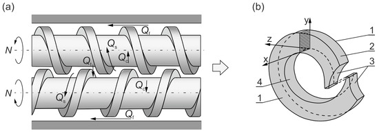 The plastic flow in a contrary-rotating double-screw extruder: (a) leakage flows, Qc—calendering flow, Qf—flight flow, Qt—pressure (tetrahedral) flow, Qs—side flow; (b) C-shaped chamber, 1—side surface of the screw flight, 2—barrel surface, 3—front surface of the screw flight, 4—surface of the screw root (adopted with permission from Wilczyński, K. Rheology in Polymer Processing. Modeling and Simulation; Carl Hanser Verlag: Munich 2021 [34]).