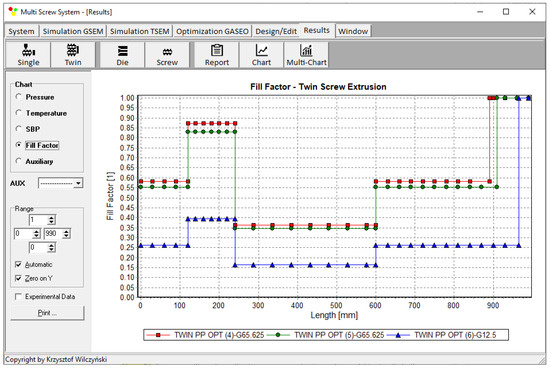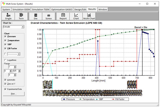 An example of computations with the use of TSEM software (and experimentation) is shown in Figure 2 for the screw system depicted in Figure 3. The experiment was performed for the extrusion of polypropylene (PP) with the screw speed of N = 100 rpm and the mass flow rate (throughput) of G = 10 kg/h. The dimensionless extrusion characteristics are presented with pressure (P—navy blue line) and temperature (T—green line) profiles, while the profile of plastic melting is represented by the solid-bed profile (SBP—blue line), and the profile of screw filling is represented by the fill factor (FF—red line). As can be seen, the pressure was only built in the region of fully filled screws. It is also interesting to note that the screws were fully filled with the material only at the final short section before the die. In the rest of the extruder, the screws were only 10–30% filled.