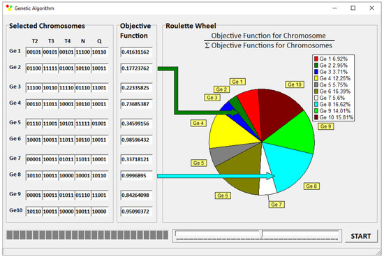 A “roulette wheel” concept was used for selection with an elitist strategy (Figure 6). In this strategy, the best dataset automatically continues to be used in the next generation, protecting the algorithm from losing the dataset with the highest value of objective functions. The algorithm stops if there is no improvement in the value of the objective function for 100 iterations. An action of the “roulette wheel” is presented in Figure 4. The areas of the “roulette wheel” defining the genotypes were proportional to the objective functions determined by these genotypes. As an example, the genotype Ge8 yielded the highest objective function F8 = 0.9996 and occupied a surface equal to 16.62% of the entire surface of this “roulette wheel”. The genotype Ge2 had the lowest objective function F2 = 0.1772, occupying a surface equal to 2.95% of the entire surface of the “roulette wheel”.