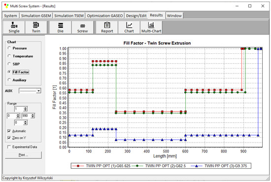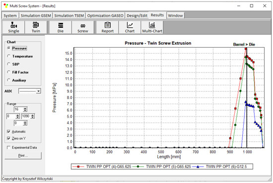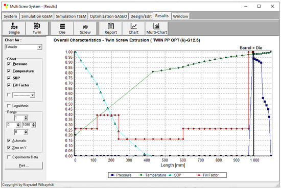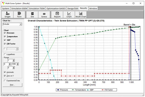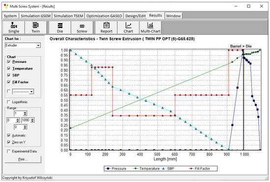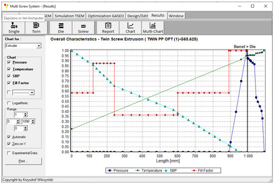 Process simulations were performed for each set of optimal parameters (N, TII, TIII, TIV, and Q). The simulation results using the optimal parameters for various weights of optimization criteria are presented in Figure 7, Figure 8, Figure 9, Figure 10, Figure 11, Figure 12, Figure 13, Figure 14, Figure 15, Figure 16, Figure 17 and Figure 18. The overall process characteristics (extrusion characteristics) obtained with the optimal parameters are depicted in Figure 7, Figure 8, Figure 9, Figure 10, Figure 11 and Figure 12, whereas the process variables, i.e., the pressure profiles (P—navy blue line), the temperature profiles (T—green line), the solid-bed profiles (SBP—blue lines), and the fill-factor profiles (FF—red line), using the optimal process parameters (N, TII, TIII, TIV, and Q) are depicted in Figure 13, Figure 14, Figure 15, Figure 16, Figure 17 and Figure 18.