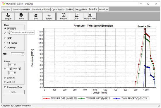 An example of using this system was presented to show the possibilities of the developed system. Optimization was carried out in order to maximize the flow rate, i.e., the extrusion throughput, minimize the plastic melting temperature at the die outlet, and minimize the plastic melting length. These parameters are important when using double-screw extruders. Contrary-rotating extruders are often used for the extrusion of thermally sensitive plastics; thus, minimizing the plastic temperature is important. Moreover, minimizing the plastic temperature means minimizing power consumption. Minimizing the plastic melting length provides a sufficiently large flow space for the good mixing of the plasticized material. Additionally, these optimization criteria were used with various weights, which depend on the manufacturer’s requirements and are decided by the manufacturer. In this example, the optimized parameters were the screw rotation, the cylinder temperatures, and the extrusion throughput, that is, the basic operating parameters of the process. Of course, optimization can be also performed for the optimization of the geometry of screws.
