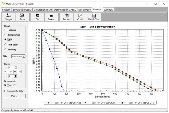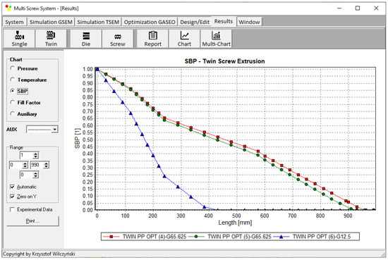 General extrusion characteristics, simulation data using TSEM model—twin-screw extrusion, Q = 8 kg/h, screw speed N = 80 rpm: SBP—solid-bed profile (adopted with permission from Wilczyński, K. Rheology in Polymer Processing. Modeling and Simulation; Carl Hanser Verlag: Munich 2021 [34]).