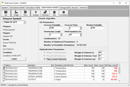The GASEOTWIN software (Genetic Algorithm Screw Extrusion Optimization) has been developed to solve the optimization issue. Simulations with the use of the TSEM (Twin-Screw Extrusion Model) software [44] were the source of optimization data. The GASEOTWIN software is characterized by TSEM-specific data exchange between the simulation program and the optimization program.