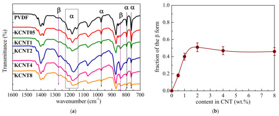 (a) FTIR spectra of the neat PVDF and the different nanocomposites under study. From top to bottom: PVDF, KCNT05, KCNT1, KCNT2, KCNT4, and KCNT8. (b) Fraction of the β polymorh in the several materials under study.