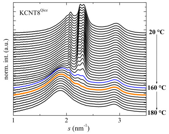Another interesting aspect is related with the presence at 180 °C in the isotropic state, i.e., in the melt of the KCNT8Qice of two amorphous halos. The one appearing at about 1.88 nm−1 is ascribed to the amorphous halo from the PVDF, while the one located at around 2.90 nm−1, which overlaps almost completely with the (021) diffraction of the α phase, is associated with the CNT. This second halo is not clearly observed in the molten state of KCNT05stretched because of the small content in CNT that is incorporated in that material. Nevertheless, it can be slightly appreciated if the profiles are amplified.