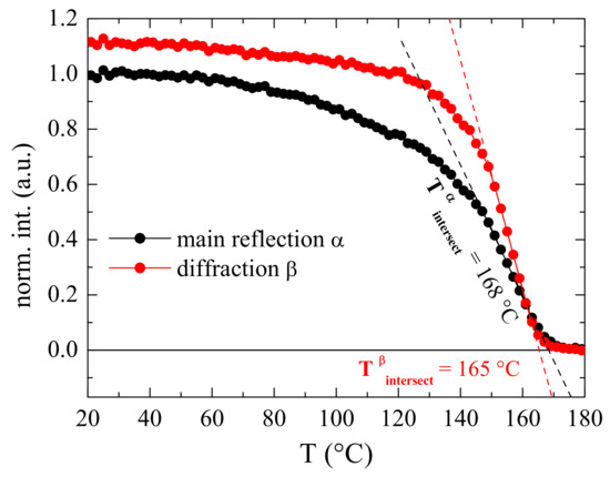 A detailed analysis of these X-ray patterns allows achieving information about the melting temperatures for these two crystalline phases, the α and the β, that coexist in this nanocomposite, as shown in Figure 6. In particular, the variation with temperature of their intensities has been evaluated. Initially, both characteristic diffractions show a rather similar intensity, as observed at room temperature in Figure 5. Then, there is a temperature interval, up to around 60 °C, at which both heights remain quite constant. At a higher temperature, the intensity of these two reflections begins to decrease but the α crystallites melt more significantly. Therefore, the intensities of the (020) and (110) diffractions diminish considerably while that for the reflection of β form is only slightly reduced (see Figure 5). This trend changes, however, at temperatures above around 140 °C where the β reflection is now the one whose height decreases sharper than those for diffractions of the α phase. Consequently, the β crystals melts at a temperature slightly lower than the α crystallites, as clearly noticed in the orange profile of Figure 5. The results represented in Figure 6 also allow quantifying the final melting temperatures (Tm) of these two crystalline phases from the slope intersecting at a zero value of their heights. Accordingly, Tmβ is 165 °C while Tmα is 168 °C.