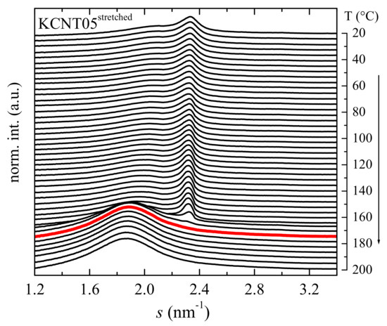 Moreover, formation of the β polymorph has been also promoted by stretching in the KCNT05 nanocomposite, which is that with the lowest CNT content, crystallizing primarily in the α form, as deduced from the FTIR and XRD results represented in Figure 3 and Figure 4. Deformation was carried out at room temperature at a drawing ratio of 2. Figure 7 depicts that the KCNT05stretched specimen only shows the β polymorph. Thus, the characteristic diffractions of the α modification are absent, this lattice being found mostly in the unstretched sample, as deduced from Figure 4. This β phase, developed partially from the α crystals together with that small amount of β crystallites initially existent in the KCNT05 sample, seems to be more perfect than that generated in the KCNT8Qice nanocomposites since it melts at a slightly higher temperature (173 °C, red profile in Figure 7).